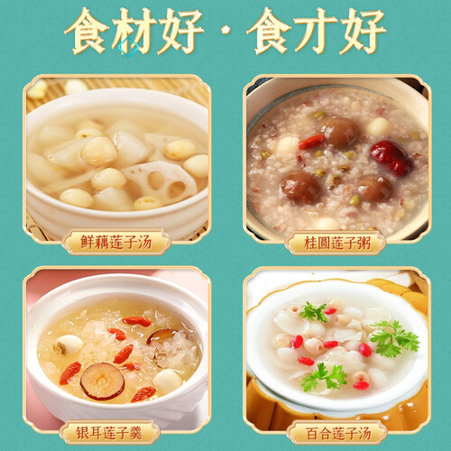 精选湘潭自然成熟的莲子,无熏硫,无漂白,色泽纯正自然,味甘清香。莲子无须泡发直接烹饪,通芯圆润,入口香甜酥软。