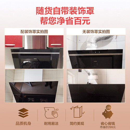 3min延时净吸,多余的油烟也可以吸的干净,厨房空气更清新。装饰罩设计,避免灰尘进入的同时还能更好的保护烟管。