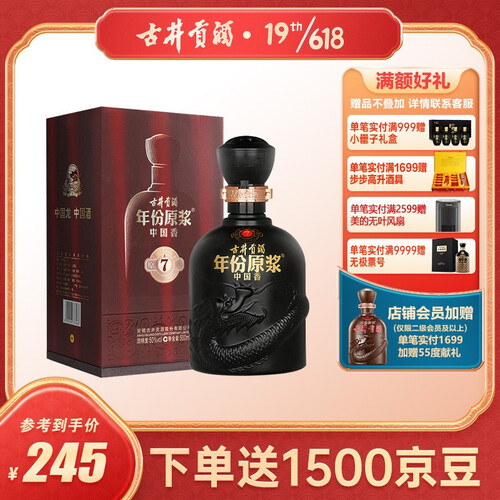 古井贡酒年份原浆古7,在明清窖池群匠心酝酿,使得酒香馥郁。口感细腻柔润,令人沉醉。外观古朴庄重,瓶身旋龙缠绕,彰显尊贵。