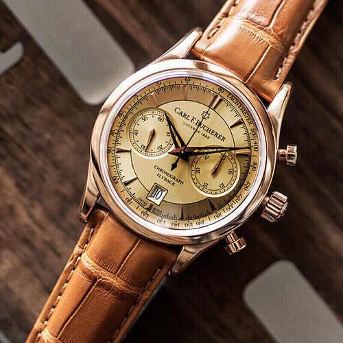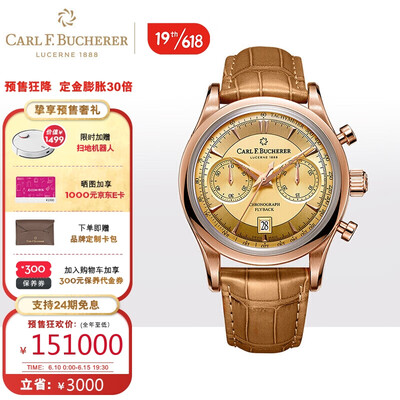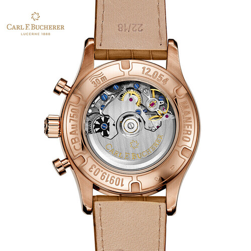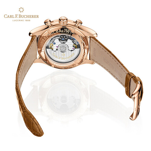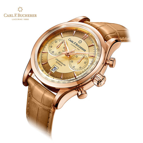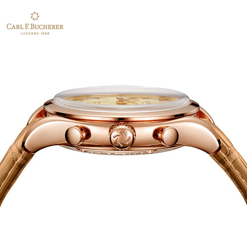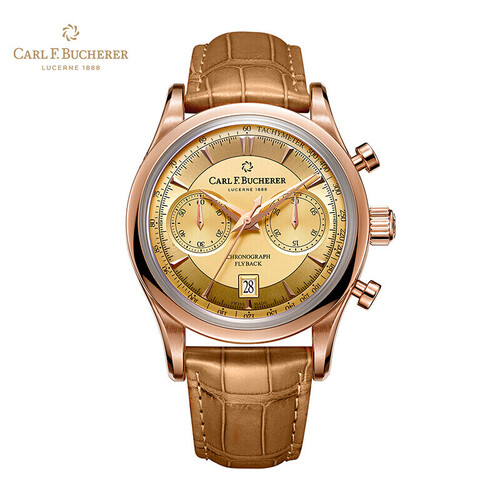 金色表盘与18K玫瑰金材质表框相得益彰,折射迷人的光彩。自动机械机芯,具有飞返计时功能。