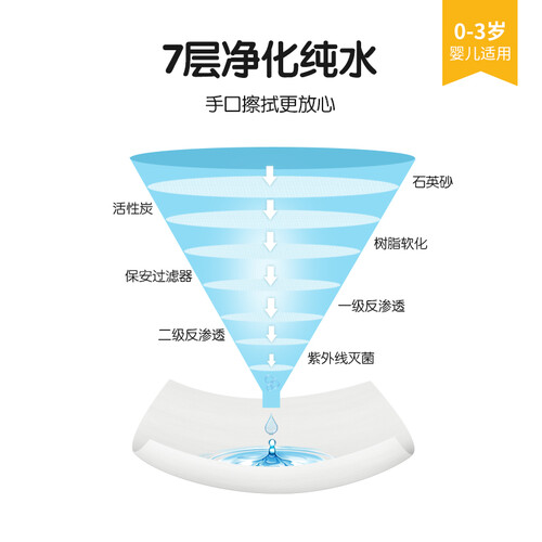 精选水刺无纺布,为宝宝带来柔软水润的触感,舒适亲肤,搭配7层净化纯水,给宝宝洁净的呵护。