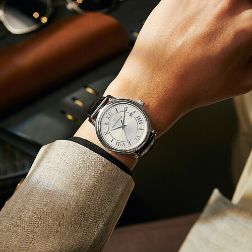 清新简约的银色表盘,更好地彰显型男的绅士气质,经典百搭。简约银色表盘,配合经典大三针,彰显低调大气。透明表背,尽显美感。