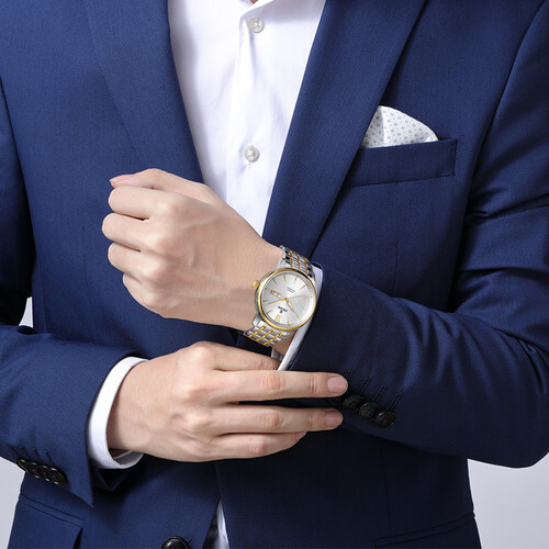精钢材质搭配金属点缀,展现出男士成熟稳重的风范。简约的大开面表盘搭配窄圈设计,带来更大的视野体验。