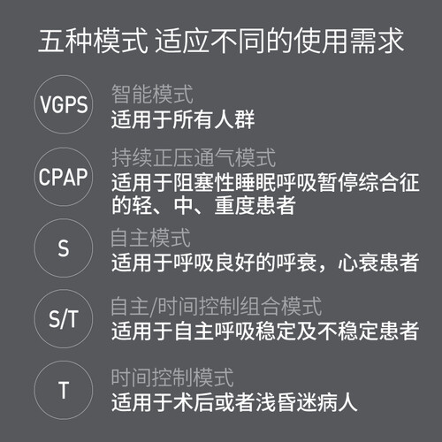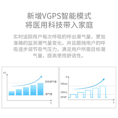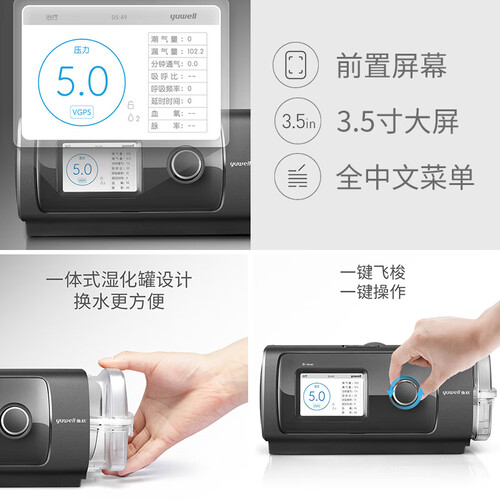 采用温控系统,湿度控制更好。人机同步设计,舒适性更好。管路加粗设计,保证高峰值流速。延迟升压功能可缓慢升压。