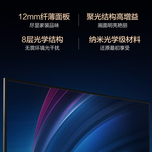 采用12mm纤薄面板设计,厚度小,搭配超窄金属边框和平整面板,尽显家装品味;8层功能光学结构,无畏环境光干扰。