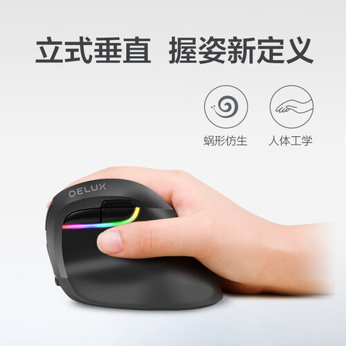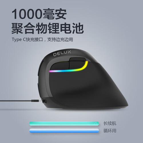 采用立式垂直设计,替代传统鼠标的扁平握姿方式,使手臂自然伸展。同时内置聚合物锂电池,可循环充电使用。