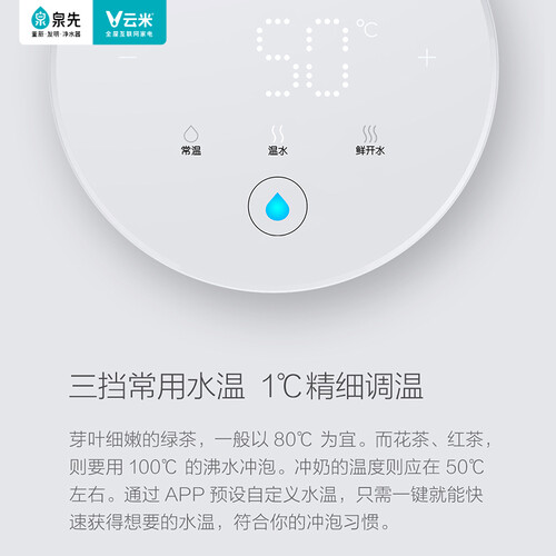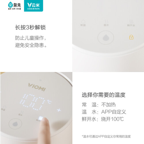 配备童锁保护装置,可以很好地避免宝宝被热水烫伤,长按3秒解锁。APP自定义温水设定,可以让你随时都能喝上热水。
