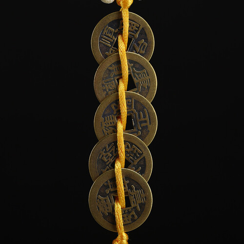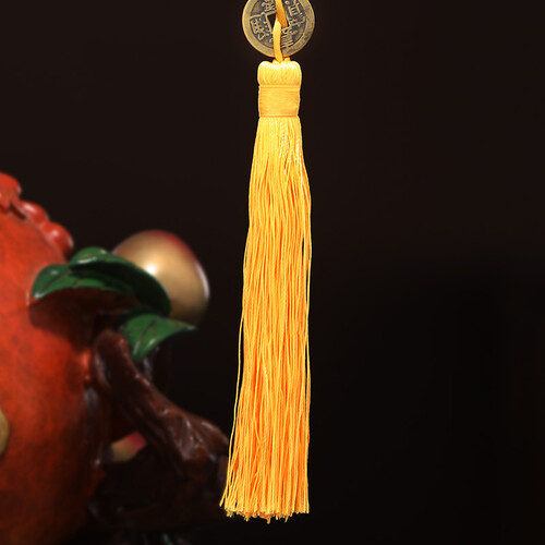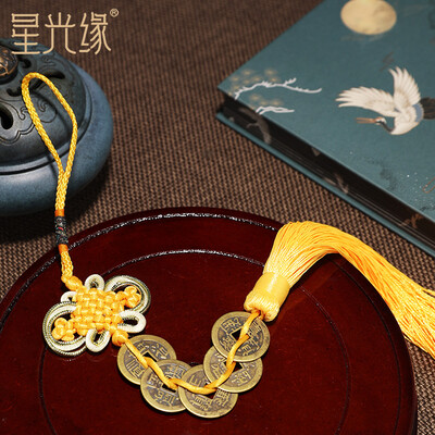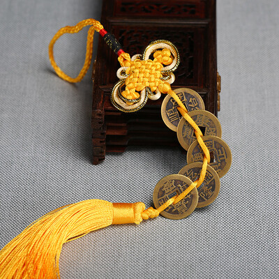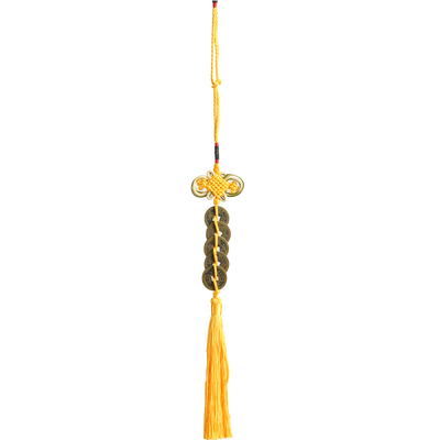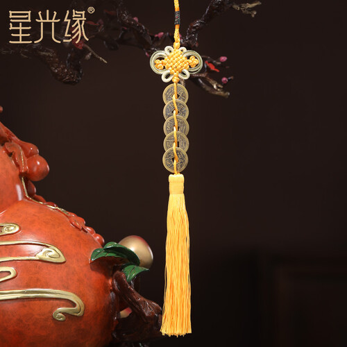 黄色中国结烘托欢乐热情,代表祥和幸福;加密流苏设计,色泽亮丽垂坠感好,不容易显旧;精心挑选铜钱,确保字迹清晰。