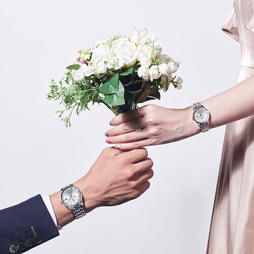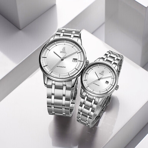 在手表简洁的外观下包裹着缜密的机械结构,同时在保留不锈钢材质的棱角的同时,辅以圆润的曲线,让每一对表散发清新的气息。