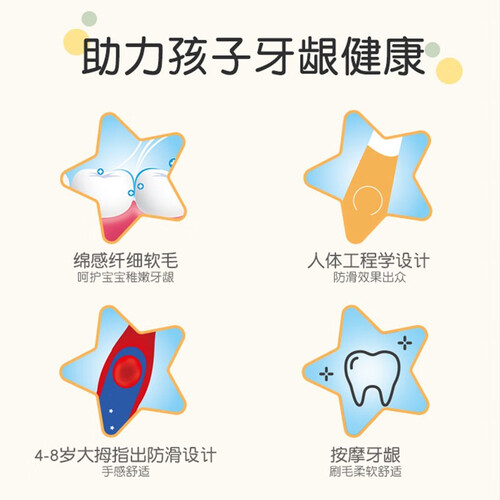 采用卡通设计的防滑手柄,柔软纤细的刷毛,可深入口腔牙龈清洁,温和呵护萌宝牙龈肌肉,维持口腔健康,宝宝爱不释手。