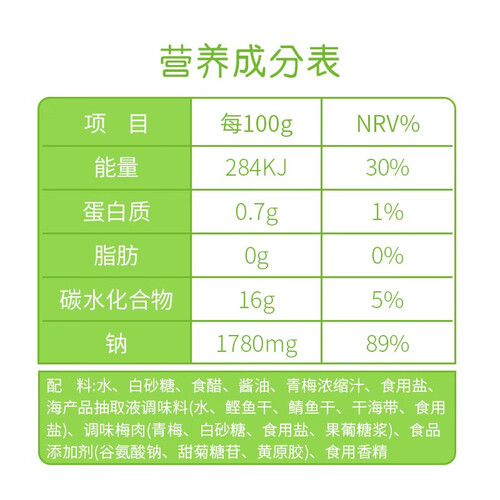 无脂肪的配方设计,不会给身体增添负担,放心食用不用担心发胖问题。浓郁的青梅香气,酸咸可口,帮你打开食欲。