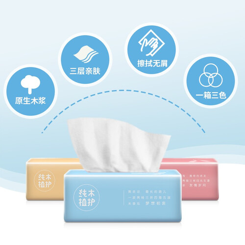 时尚外包装,高颜值,适合出行携带。原生木浆打造,无其他添加,自然健康。细密质感,柔韧性强,湿水不怕破。