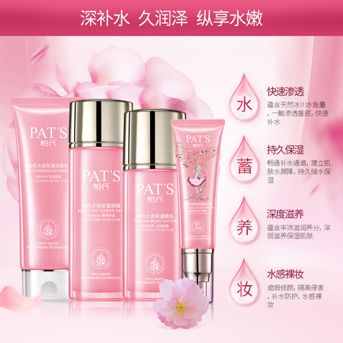 带有天然樱花精粹成分,具有良好的补水保湿功能,令肌肤晶莹剔透。还有保湿洁面乳,能温和带走肌肤污垢,使肌肤更柔软滑嫩。