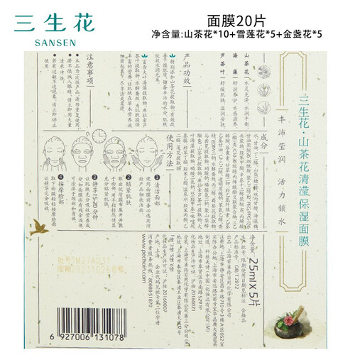 含山茶花和海藻等植物精粹,能够深层润泽肌肤,为肌肤补充更多的水分;精选优质膜布打造而成,高度服帖于你的面部。
