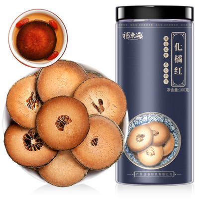 源自化州原产地,取自3年陈橘红果切片,表皮绒毛金黄,冲泡后果香味浓、汤色清亮。