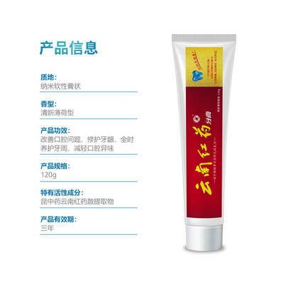 云南红药牙膏,匠心传承。蕴含十味中草药精粹成分,养护牙周,呵护口腔环境健康。还含有薄荷因子成分,改善口腔异味。