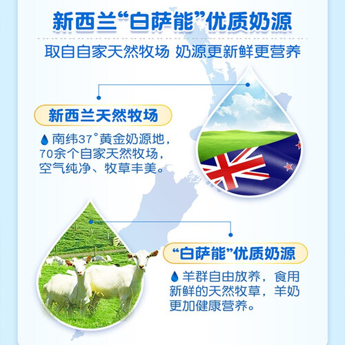 新西兰黄金奶源地,空气纯净,牧草丰美,乳制品天然优质。新西兰羊乳脂肪球蛋白颗粒只有牛乳的1/3,易吸收好消化。