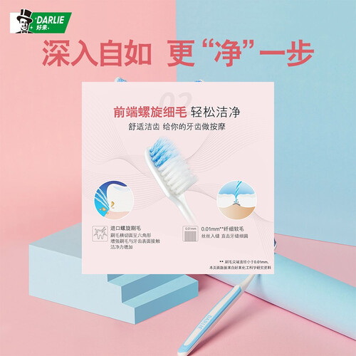 前端螺旋细毛,轻松洁净牙齿,带来愉悦的使用体验;根据人体工程学设计手柄,手感舒适;纤细软毛,直击牙缝细菌。