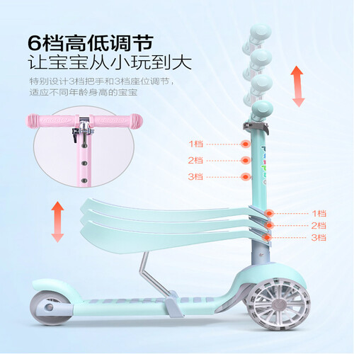 可坐可站的滑板车,玩法多样,滑行时更过瘾。重力转向系统搭配45度限位,能够锻炼平衡力,宝宝更易操控。