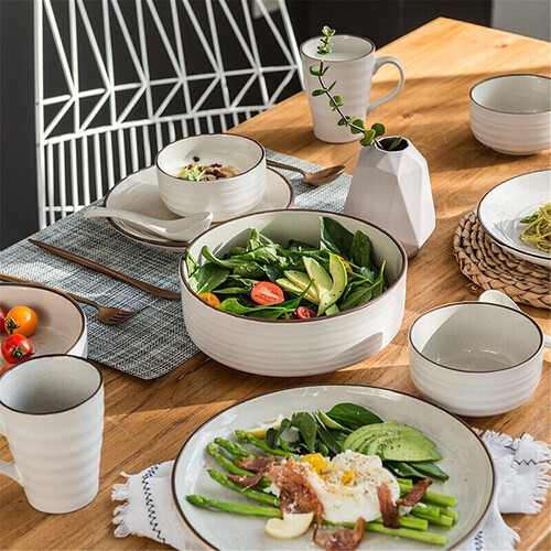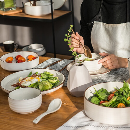 浮雕螺纹设计,如同水波荡漾,使餐具更具韵律美感。餐具内分布大量芝麻釉点,疏密不一,能轻松营造各种意境。