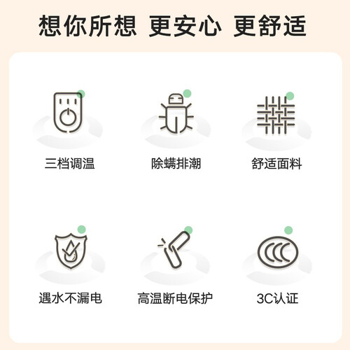 内置三档温度模式设定,根据个人选择合适温度,舒适温感轻松入睡,控温更简单。12小时自动关停,避免忘记断电发生意外。