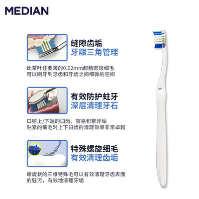 牙刷毛束采用超微细毛,牙渍也能有效去除,令牙齿缝隙洁净无残留。扇面磁球能够按摩牙齿,清除牙垢,令牙齿洁净亮白。