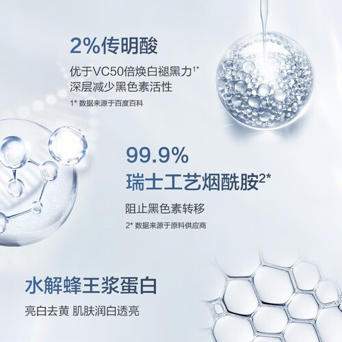 传明酸成分,避免肌肤沉积过多的色素,肌肤有光泽。水解蜂王浆蛋白,舒缓你的肌肤,打造紧致的肌肤。
