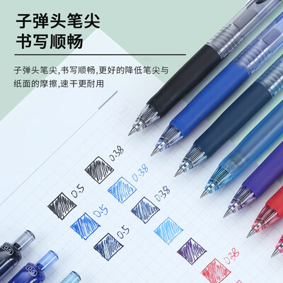 子弹头笔尖设计,出墨稳定流畅,耐水性能高,能够减少书写晕染现象,配上软胶笔握设计,握感舒适久握不累。