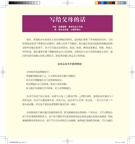 这本书采用故事形式,告诉还是什么是抑郁。帮助孩子学会情绪管理,让孩子学会处理情绪,对保持心理健康正向影响。
