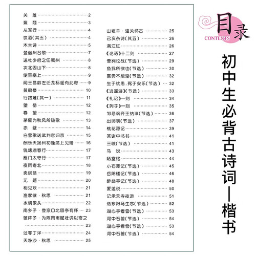这本书包含的内容较为丰富,对于行楷的书写技法讲解透彻而细腻,配合初中的古诗文,练字的同时还能巩固课堂知识。
