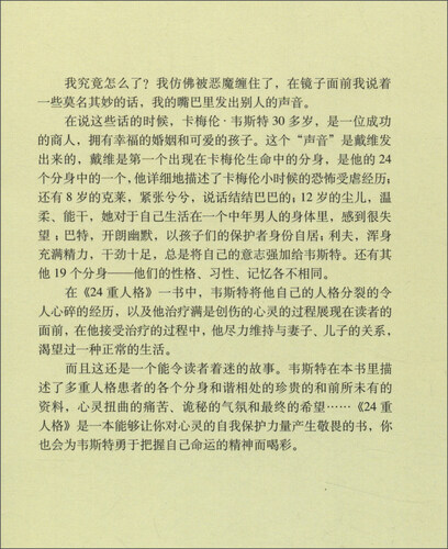 这本书讲述了韦斯特令人心碎的人格分离经历,以及治疗他满是创伤心灵的过程,在他治疗的过程中,他尽力的维持着与亲人的关系。