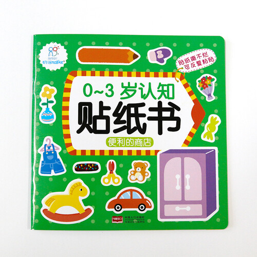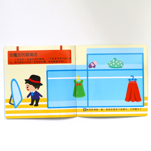 《便利的商店》中选取了宝宝日常生活中常见的商店,让他们在贴贴纸的过程中了解不同商店的特点,同时认知不同的服装、玩具等。