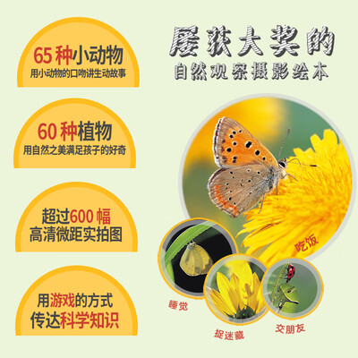 这本书采用了65种小动物、60种植物、超过600幅高清微距实拍图,让孩子近距离接触大自然,带孩子打开大自然的生命之门。