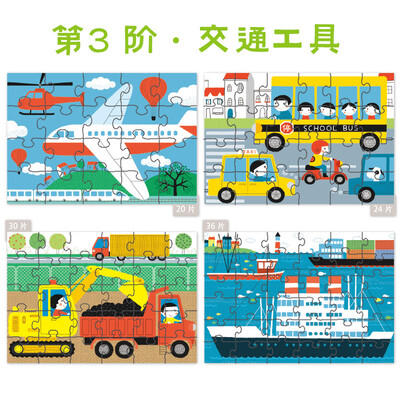 包含4张拼图,拼图块数分别为20、24、30、36,难度循序渐进,可帮助孩子逐步培养自信心和专注力。