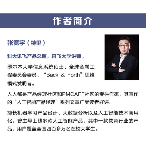 这本书回归人工智能产品的本质,通过对产品的体系架构和设计流程进行提炼和概括,定义了人工智能产品经理这个岗位所需要的能力。