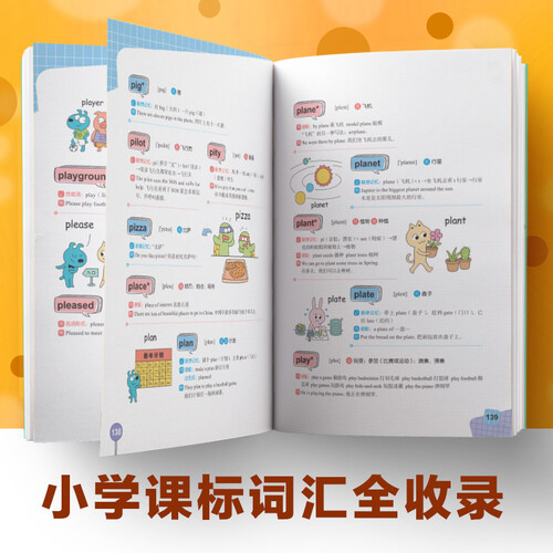 采用图文结合的方式,呈现小学阶段必备的单词、短语和句型,同时融入情景化的对话与场景,引导孩子理解性记忆。