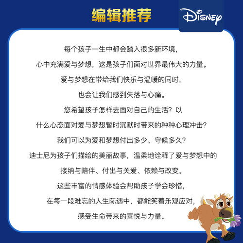 迪士尼的一个个小故事能够引发孩子对爱的认识和对梦想的追求,图文并茂的讲述引发孩子阅读的兴趣,让孩子学会爱,学会感恩。