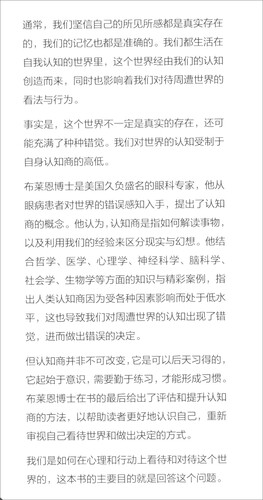 这本书细致地分析了人的感觉与真实情况之间的差别,提出了科学培养认知商的方法,帮助人们升级认知水平,做出更加明智的决策。