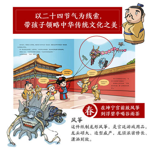 这本书以二十四节气作为线索,参照故宫的实景,采用手绘色彩插图的形式,为孩子打造纸上故宫,并在翻页中感受节气的变化。