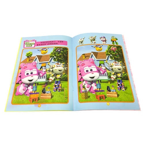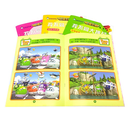 以孩子们熟知的超级飞侠作为书本的主人公,让孩子寻找看似相同的两幅画中的不同之处,提高孩子的颜色和图形的认知水平。