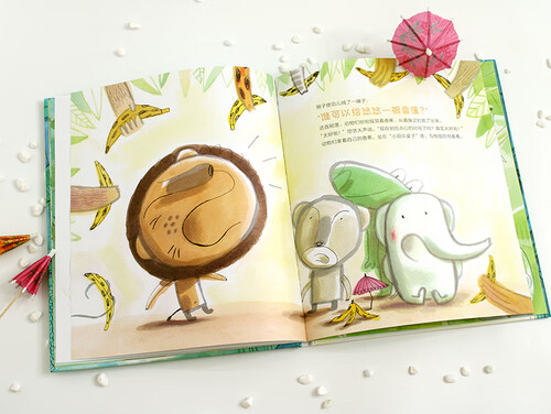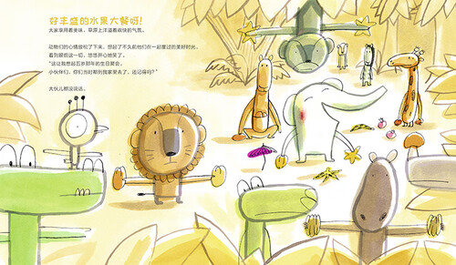 动物们互相争吵着,乱打着,水果从四面八方扔过来,掷过去。突然间,小象悠悠举着小阳伞来到了战场中央,他把记忆给弄丢了。