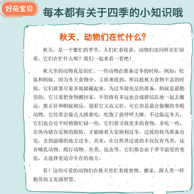 以春夏秋冬四个季节为主题,让孩子能够明白每个季节当中动物和植物的特有的生存方式,从而对大自然拥有更加深入的了解。