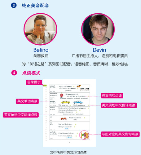 本书为英汉双语点读版,所有单词例句均配有英语母语专业人士纯正发音朗读,以娱乐化的方式让孩子学习英语,简单实用。