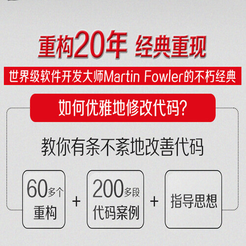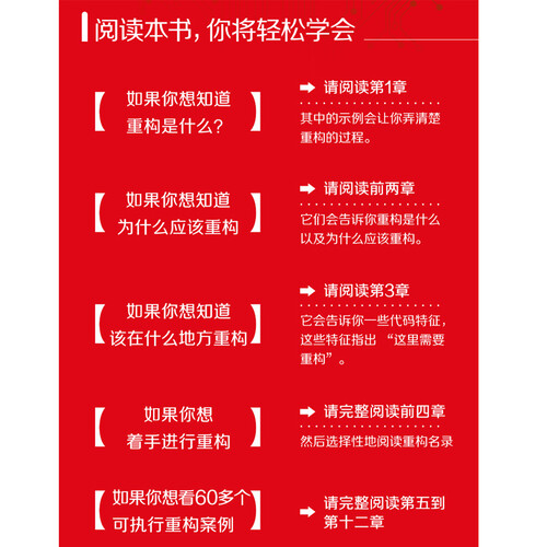 书中凝聚切实可行的60多个重构,旨在帮助开发人员一次一小步地修改代码,大大降低开发过程中的风险。