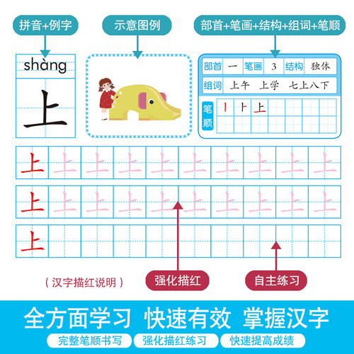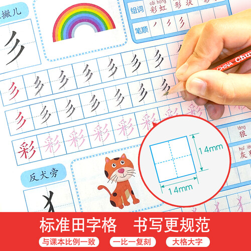 设计有铅笔描红的功能,可以帮助孩子练字,从小打下良好基础。采用优质的原生木浆制作纸张,坚实耐用,不伤眼。