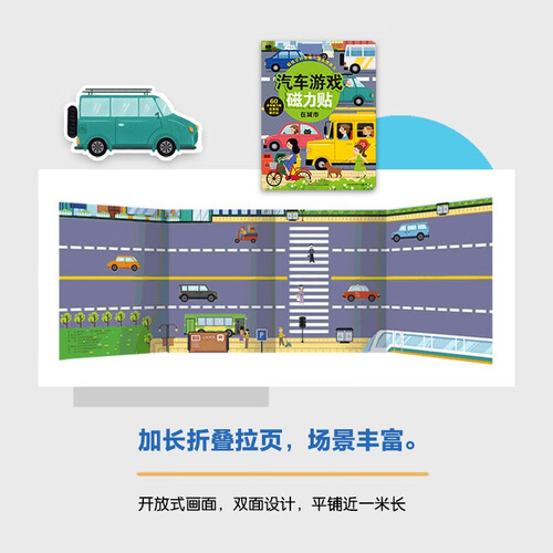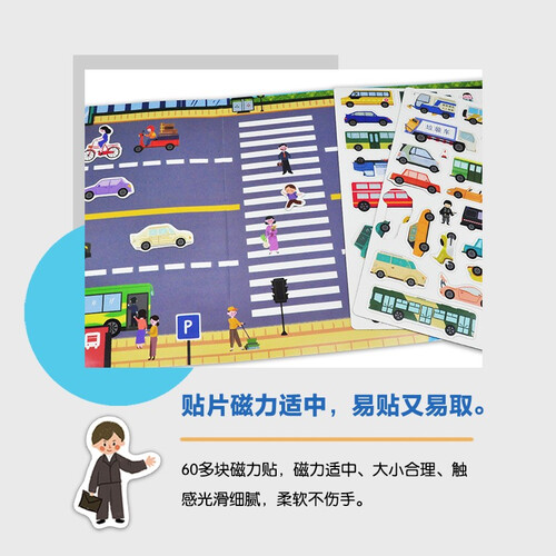 此书附有两张磁力贴,在双面开放式拉页上,可以反复粘贴不同的汽车,让孩子在动手能力中,更加直观地认识城市汽车的类型。