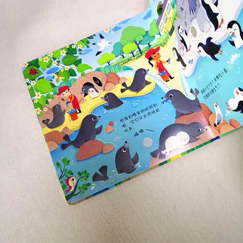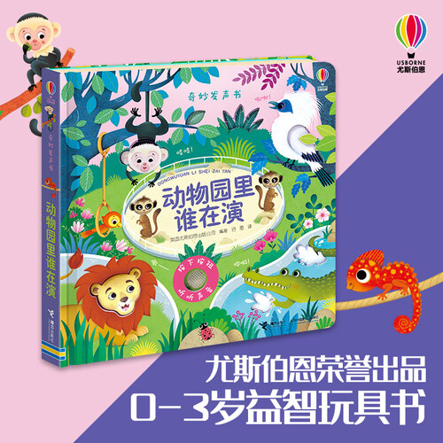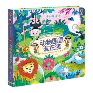 采用跨页大图与简单的文字,为孩子呈现动物园形形色色的动物,同时搭配发声装置,带孩子了解动物的叫声。