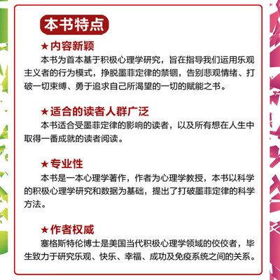 这本书作者根据自己多年的心理学研究经验,指导读者以乐观主义者的心态,挣脱墨菲定律的禁锢,勇于追求自己所渴望的一切。