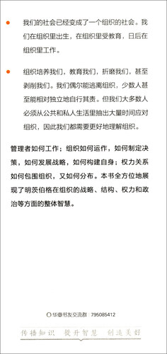这本书立足于企业内部真实的运作,从结构、战略等多方面论述了组织管理之道,知识点丰富。采用图文结合的讲解方式,通俗易懂。