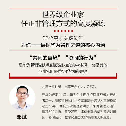 这本书讲述了任正非的丰富的管理经验,为我们揭开华为的思考法则、工作方式、话语体系,直抵华为管理的本质和精髓。